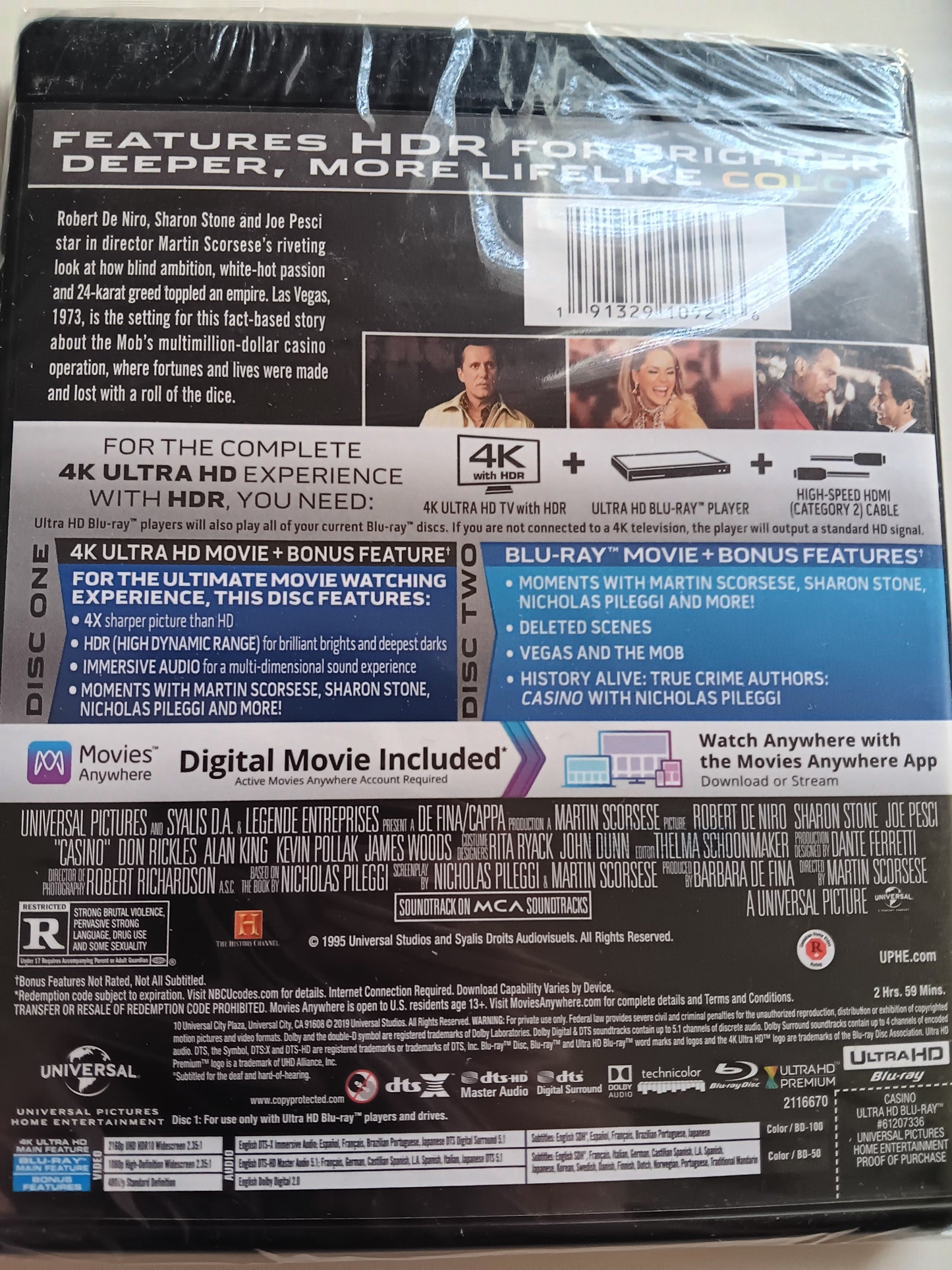 - Includes 4K UHD, Blu-ray and a digital copy of Casino (Subject to expiration. Go to NBCUCodes.com for details.)