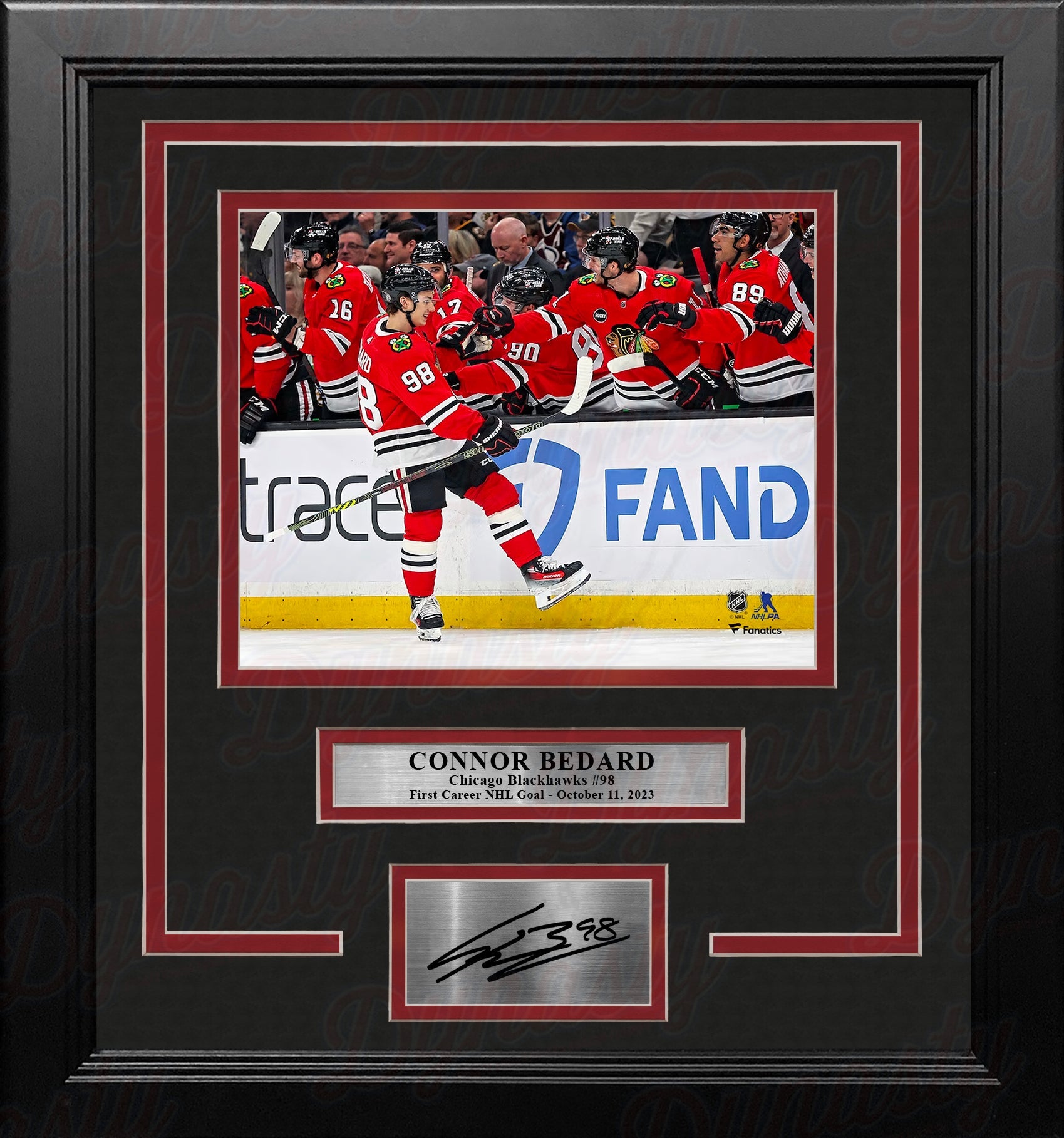 Connor Bedard First NHL Goal Chicago Blackhawks 8" x 10" Framed Hockey Photo with Engraved Autograph