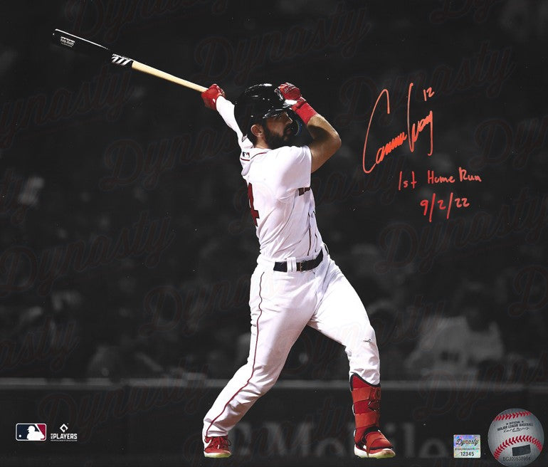 This officially licensed photo has been hand-signed by Boston Red Sox star catcher Connor Wong, seen here in spotlight-style photography hitting his first MLB home run. Connor personally autographed this item during a public autograph signing on June 15, 2023, and the item includes a serially-numbered Dynasty Sports hologram of authenticity.