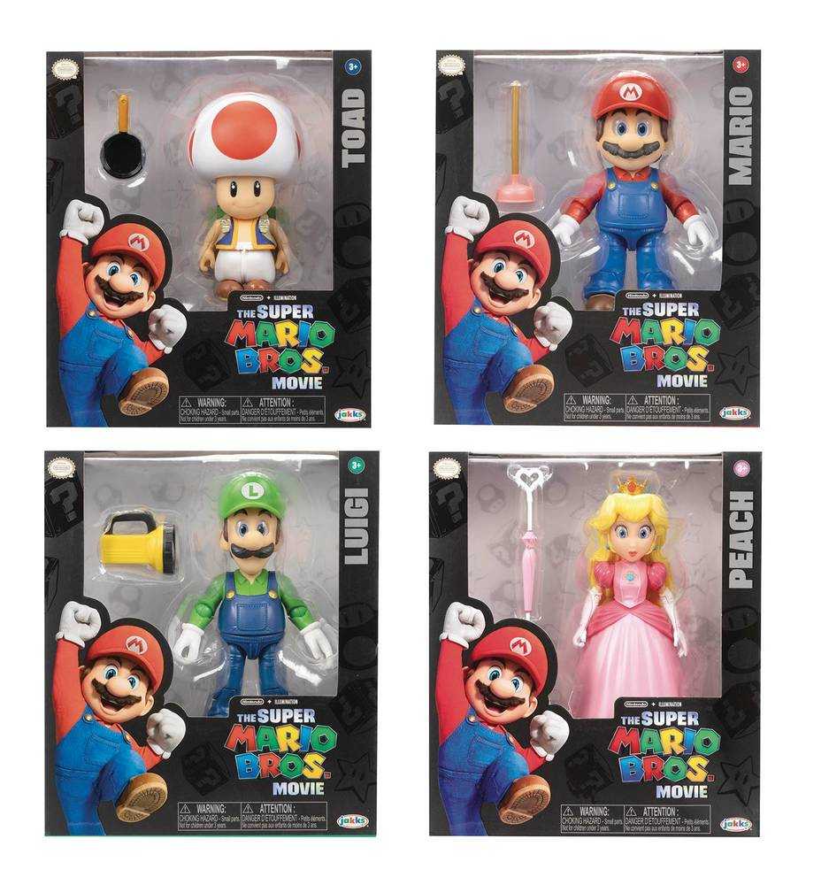 From Jakks Pacific. The Super Mario Bros. Movie 5" Figure Series Wave 1 features Mario, Luigi, Peach, and Toad. Each figure comes with premium details, realistic acrylic eyes and has 8-16 points of articulation. Every character comes with its own movie accessory like Mario's plunger or Luigi's flashlight!