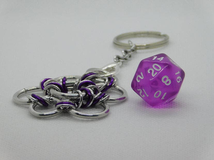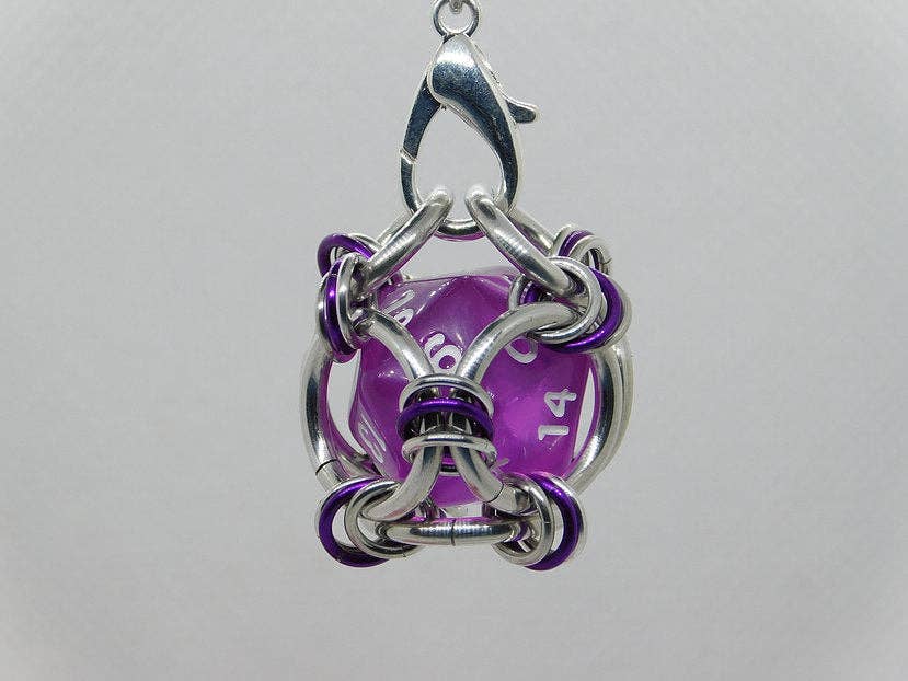 These durable, airtight glass jars include a black dragon sticker and matching 7pc dice set with a high quality, handmade aluminum chainmail Keychain Dice Cage.