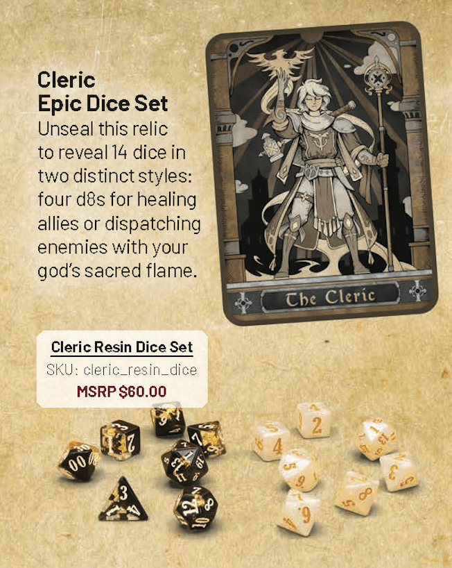 Realize your full potential as a Cleric with these leveled-up dice sets from Beadle & Grimm’s. Each set contains beautiful resin dice specific to your role, and those dice will roll beautifully in the large, EVA-lined tins that double as rolling trays! Unseal this relic to reveal 14 dice in two distinct styles: four d8s for healing allies or dispatching enemies with your god’s sacred flame.