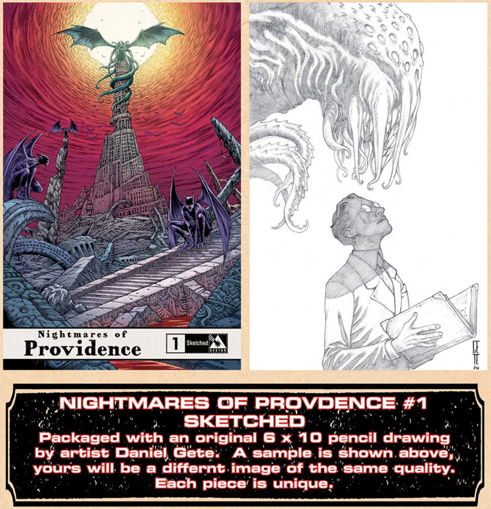 Nightmares of Providence#1 is a 64 page B&W saddle-stitched book featuring all-new art exploring the world and terrors of Providence from a huge range of talent including Gabriel Andrade, Christian Zanier, Ivan Rodriguez, and featuring Daniel Gete! Every cover is limited! Super-star artists deliver these haunting covers for $6.99 each and $19.99 for the Leather: Wisdom (lmt to 3000 copies) and Siren (lmt to1000) by Gabriel Andrade. Wraparound (lmt to 1000) by Renato Camilo. Curious, NCosta Wrap, and Deep Green Leather (each lmt to 1000) by Christian Zanier, and Wheatlys (lmt to 1000) and the Sketched Edtion, each featuring a unique original piece of art by Daniel Gete! Only 65 of the Sketched editions are available at just $99.99 each.