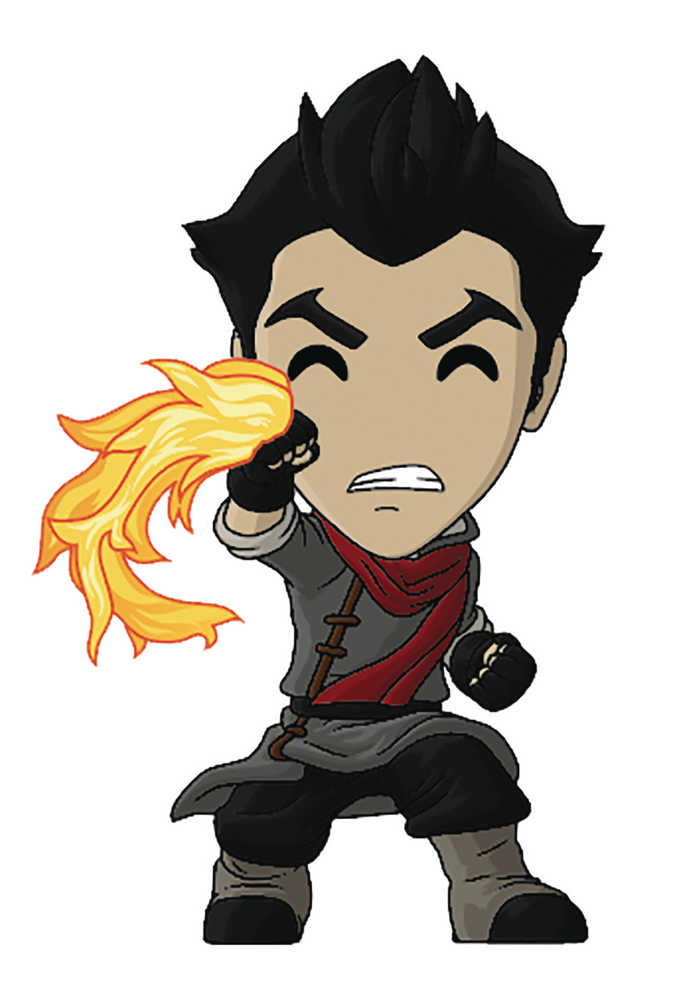 From Youtooz. Mako stands at 4.8 inches, determined to do whatever it takes to win. He is dressed in gray and black clothing, with elements of red throughout to signify the Fire Nation. The exterior of his double-walled packaging shows him inside the gym, training his firebending. The interior is a clay wall with the 4 Nation's symbols carved on it.